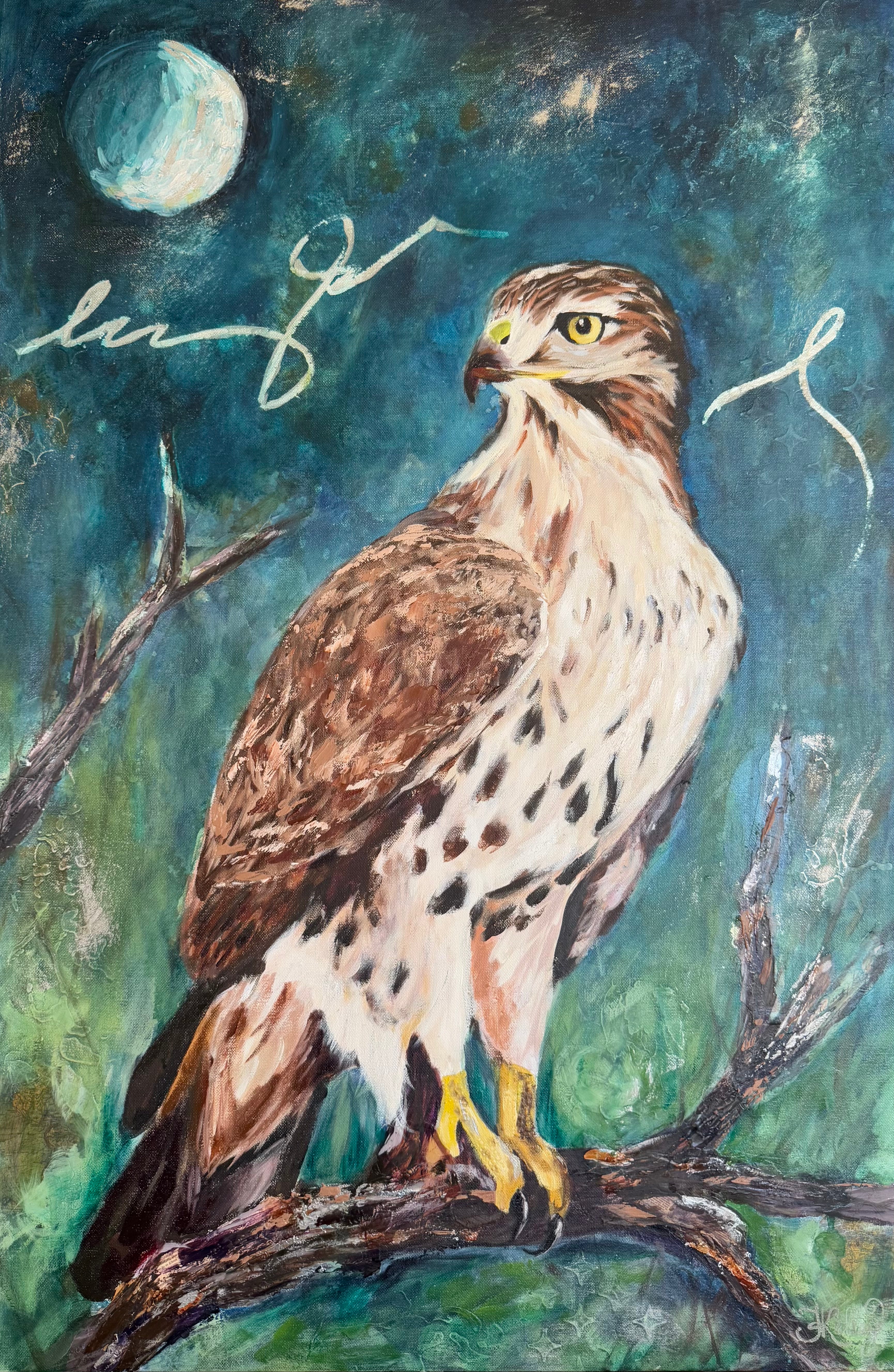 Original painting. Oil over mixed media on a 3/8" canvas. Edges are finished in gold, and hanging wire is attached on the back for quick, easy display. Comes with a certificate.