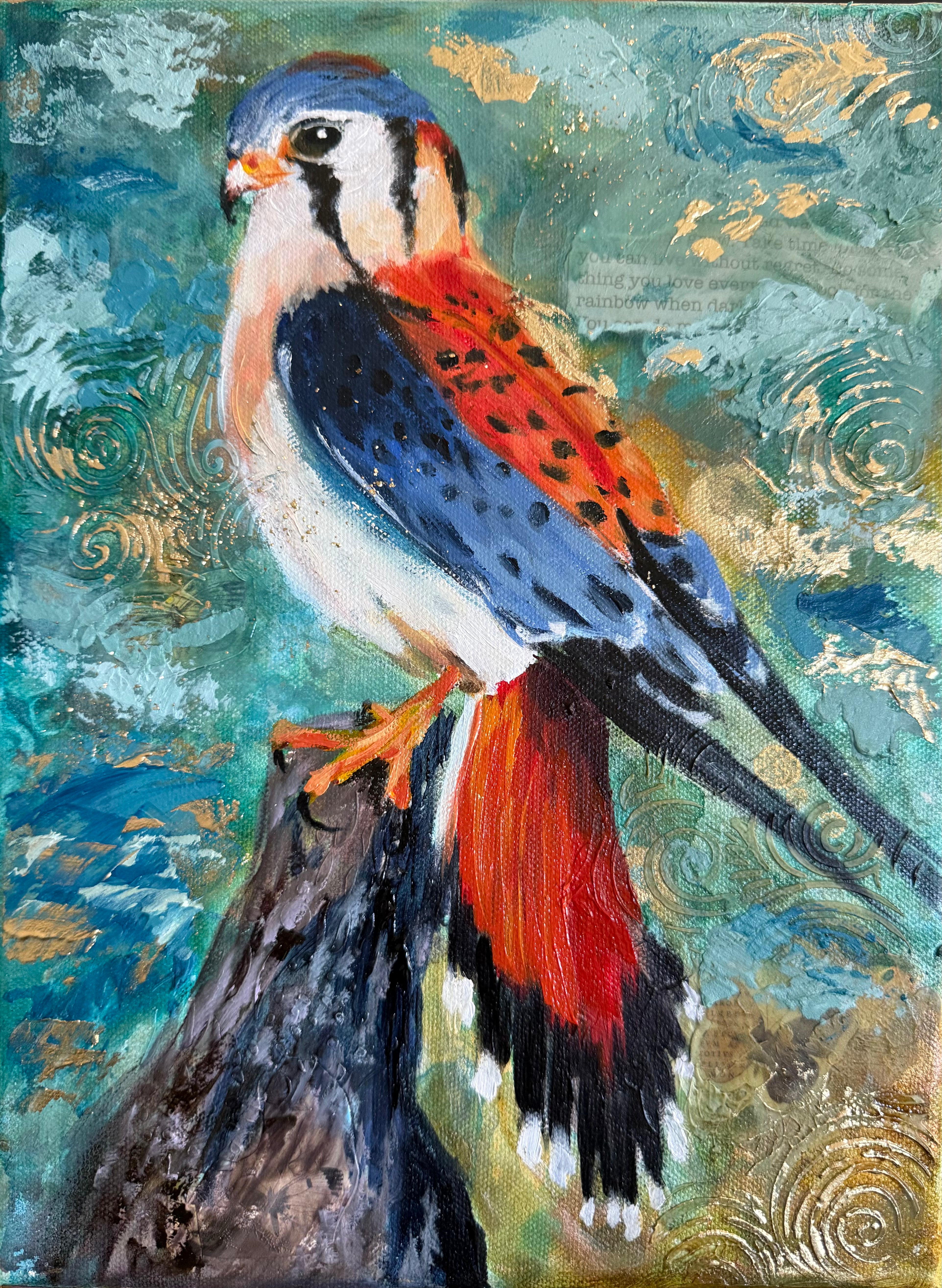Original painting. Oil over mixed media on a 3/8" canvas. Edges are finished in gold, and hanging wire is attached on the back for quick, easy display. Comes with a certificate.
