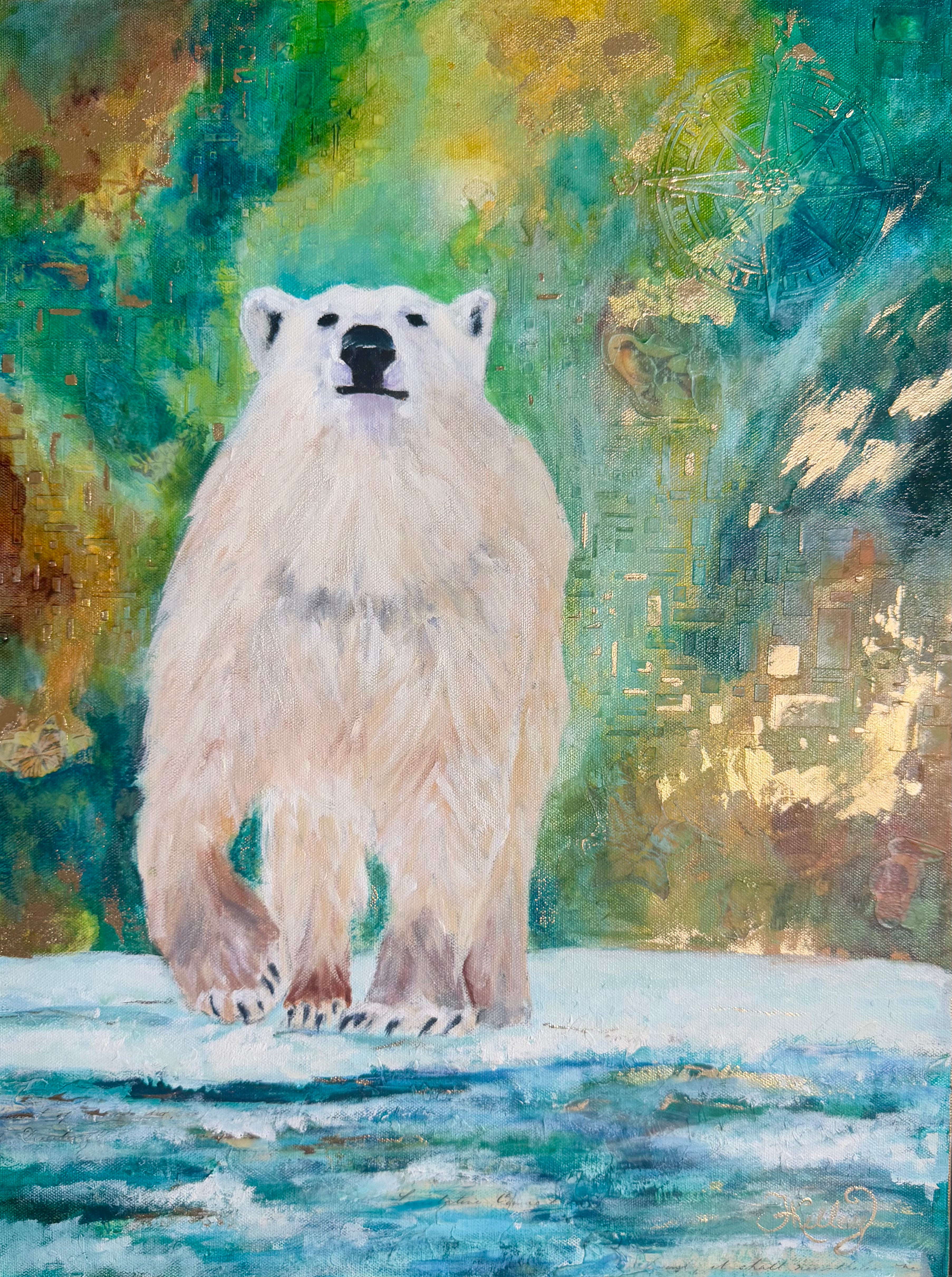 The guardian of the Arctic traverses the glacial ice beneath the mystical Aurora Borealis.