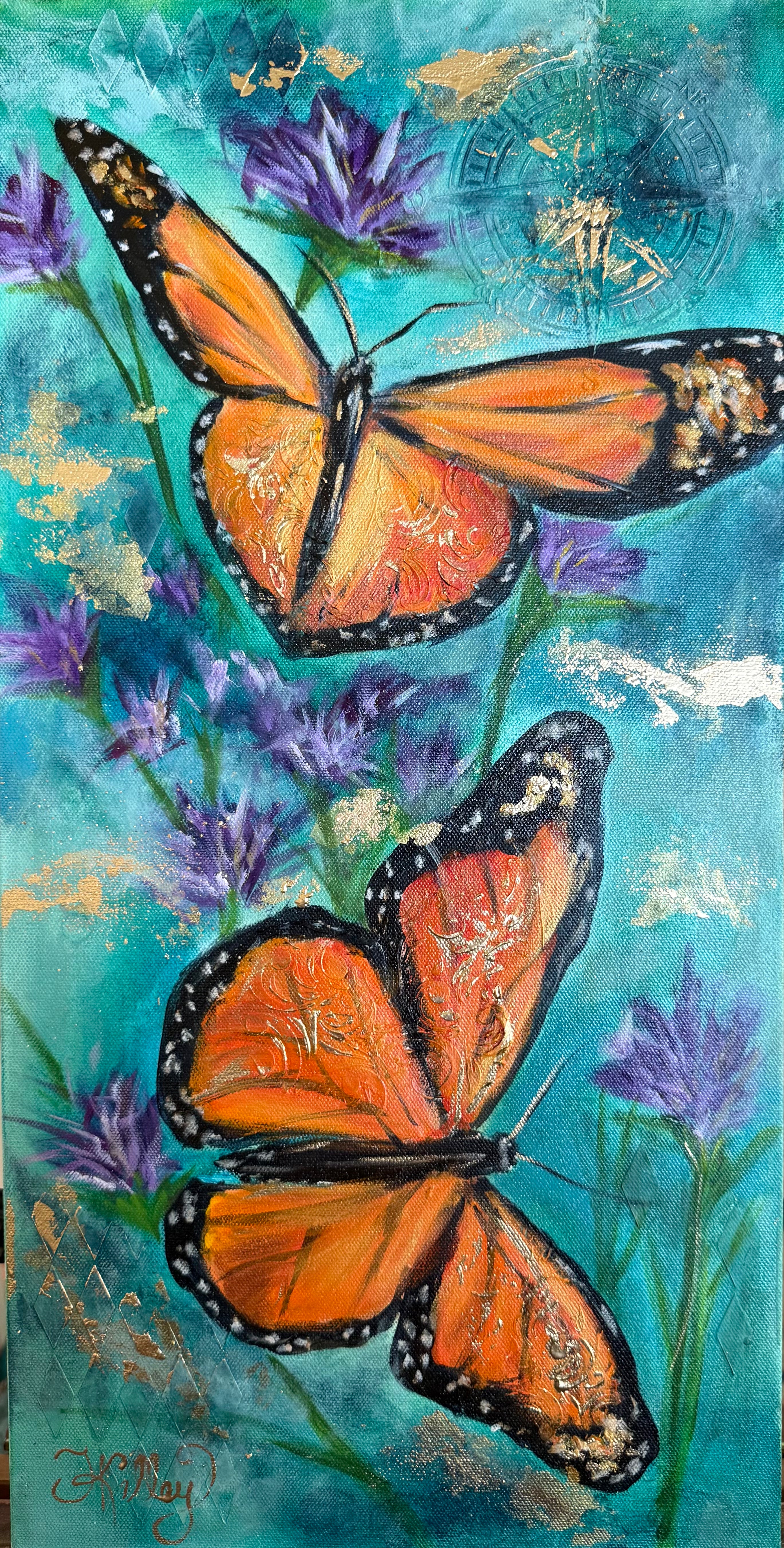 Original painting. Oil over mixed media on a gallery wrapped canvas. Edges are finished in gold, and hanging wire is attached on the back for quick, easy display. Comes with a certificate.