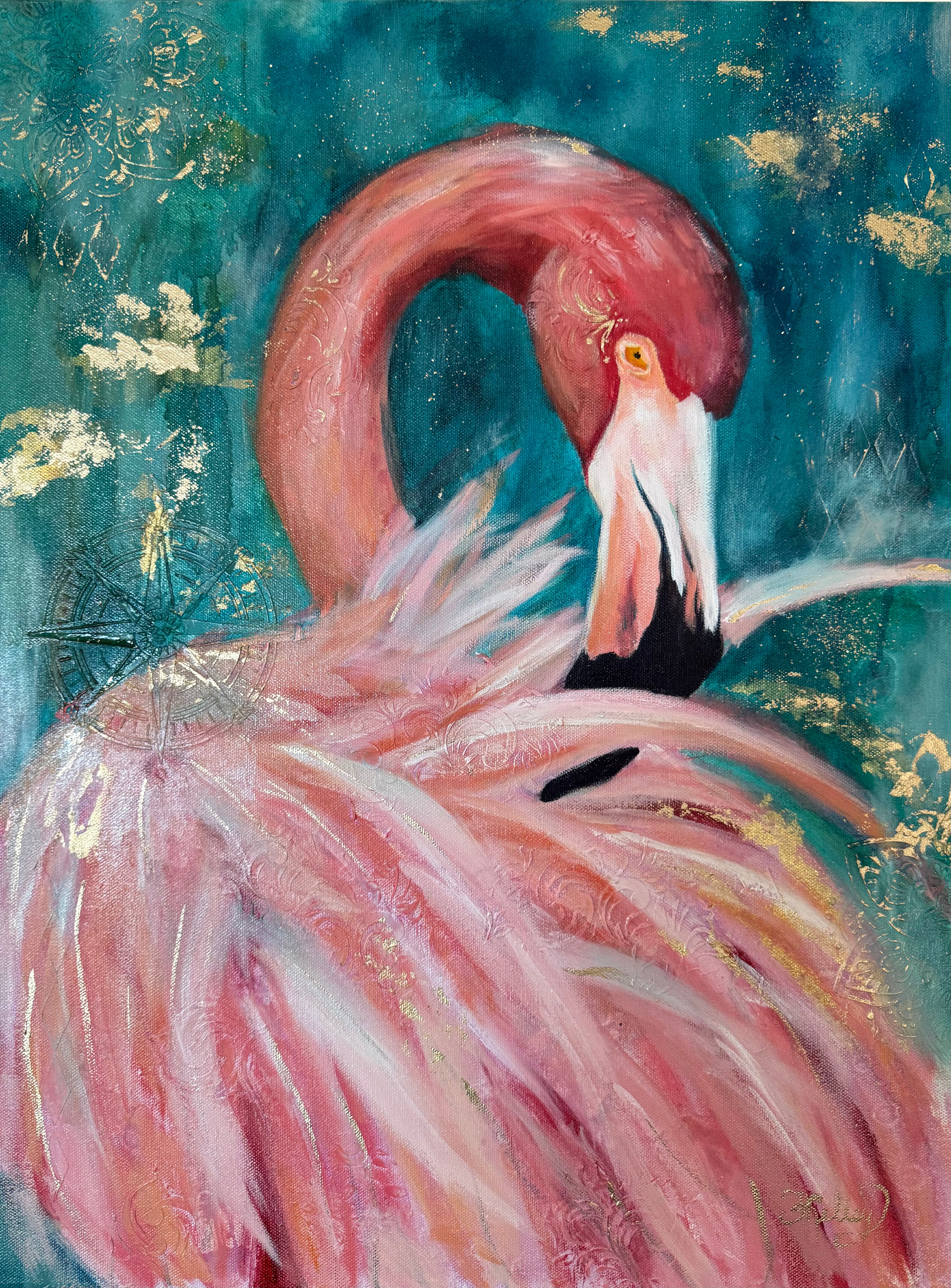 Original painting. Oil over mixed media on a gallery wrapped canvas. Edges are finished in gold, and hanging wire is attached on the back for quick, easy display. Comes with a certificate.