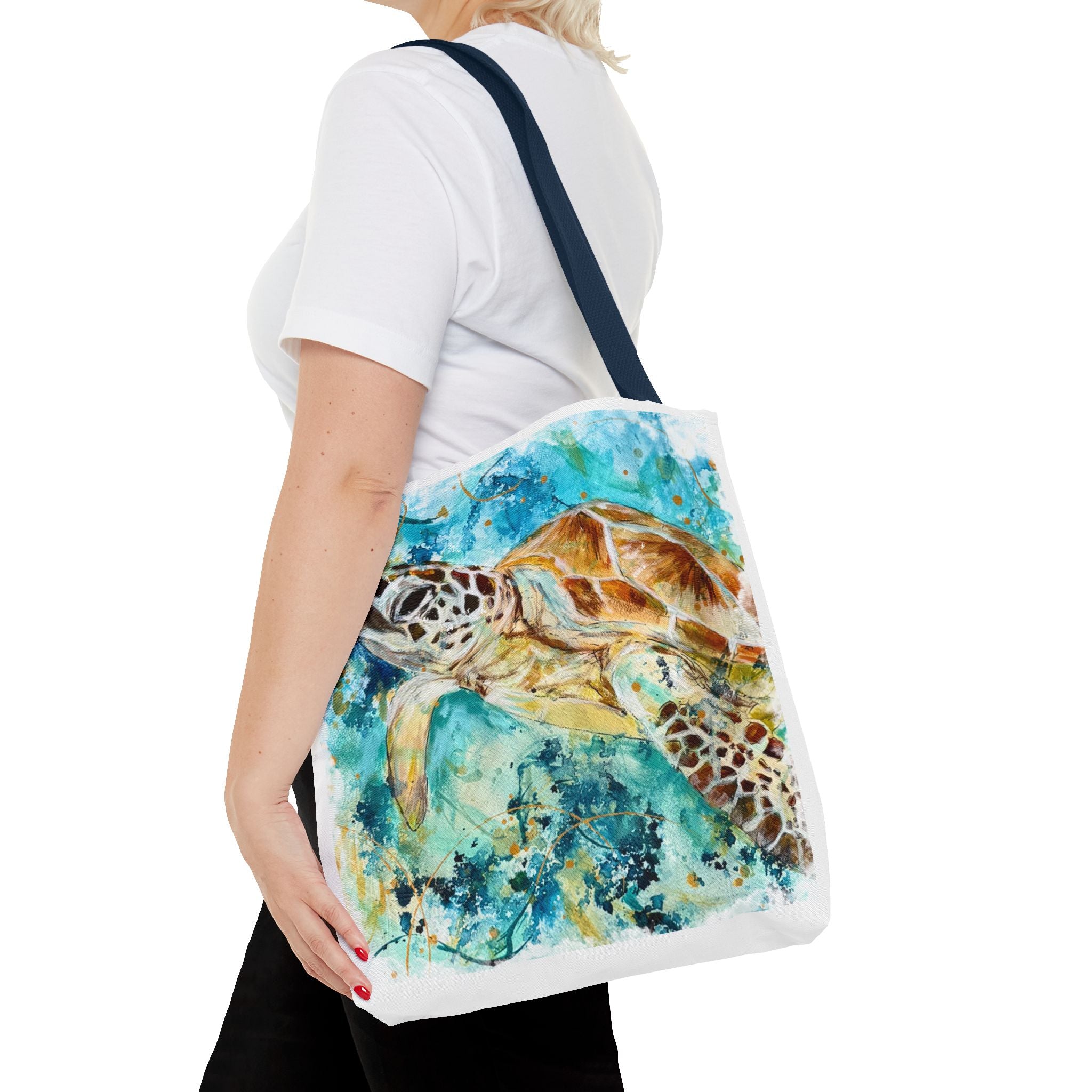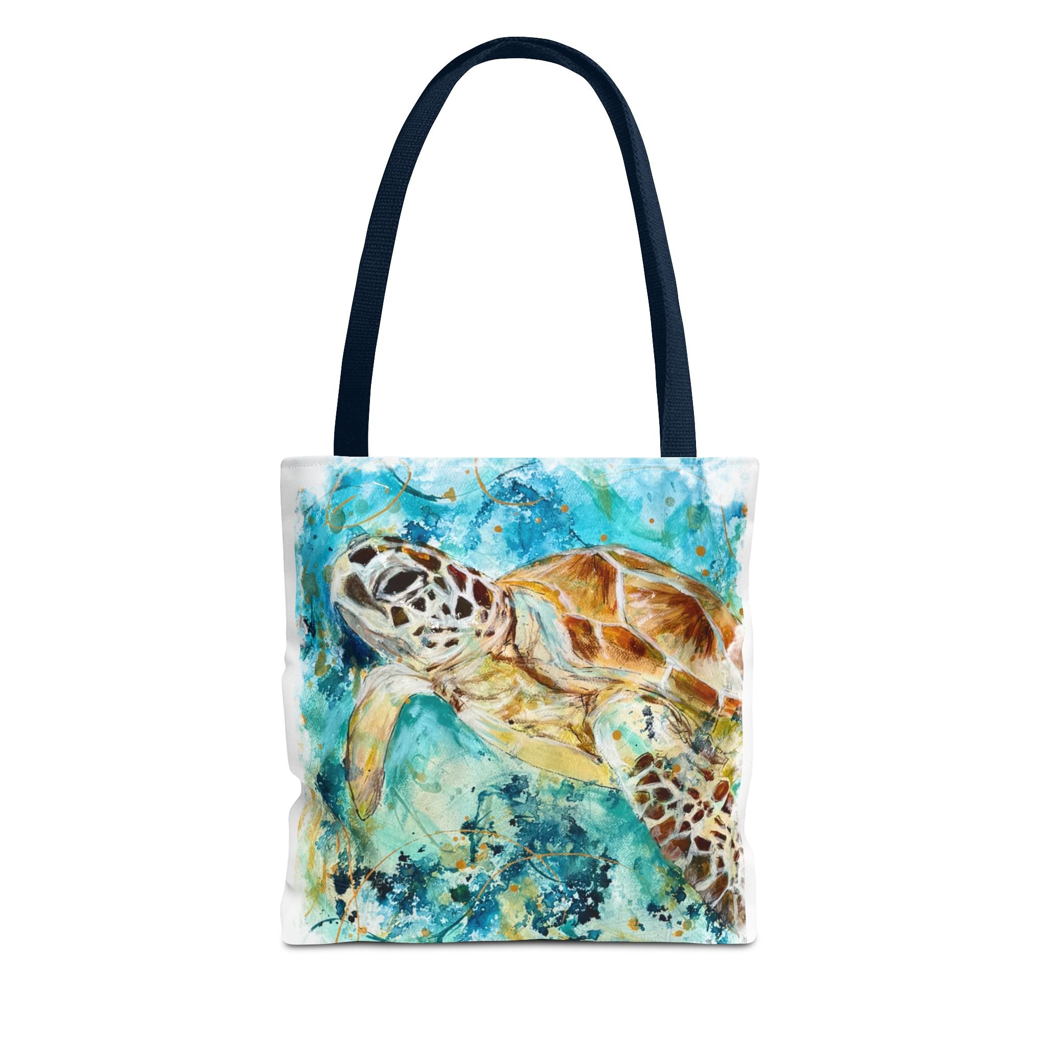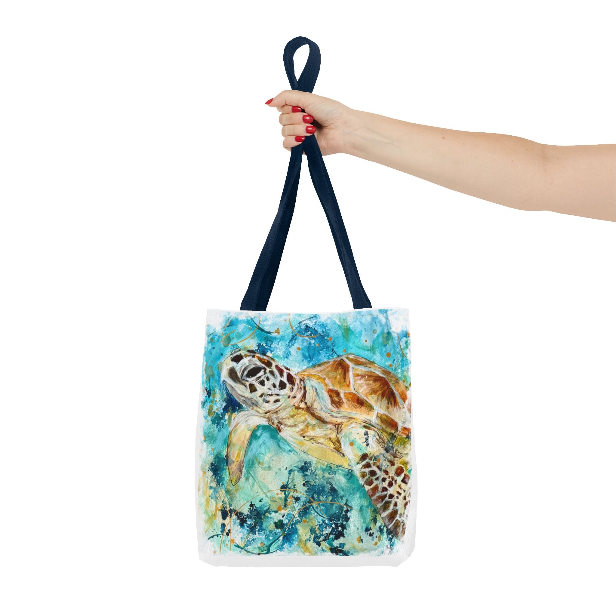 Carry a piece of the ocean with you. This durable polyester tote features a vibrant watercolor sea turtle gliding through turquoise currents — colors that still feel sun-warmed and salt-kissed. The roomy boxed corners give the bag real carrying space for market finds or beach gear, while the reinforced handle stitching and medium-weight fabric stand up to everyday use. Lightweight, quick-drying, and lined with a non-woven laminate, it balances artful style with practical resilience. Pick a handle color to match your mood and size to match your needs; this tote moves seamlessly from shoreline strolls to city cafés.