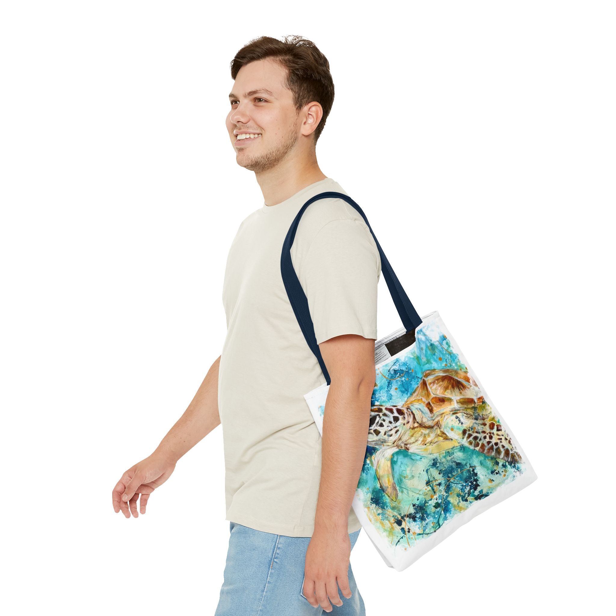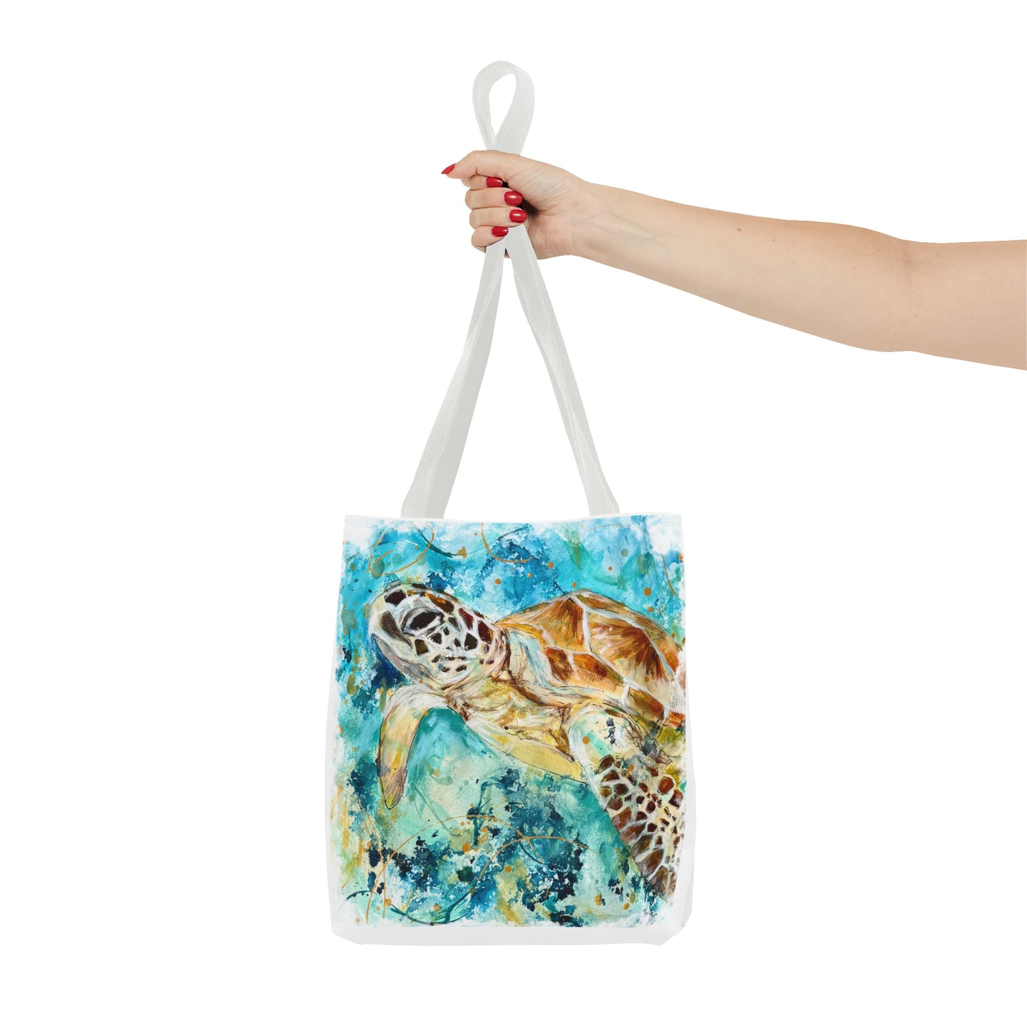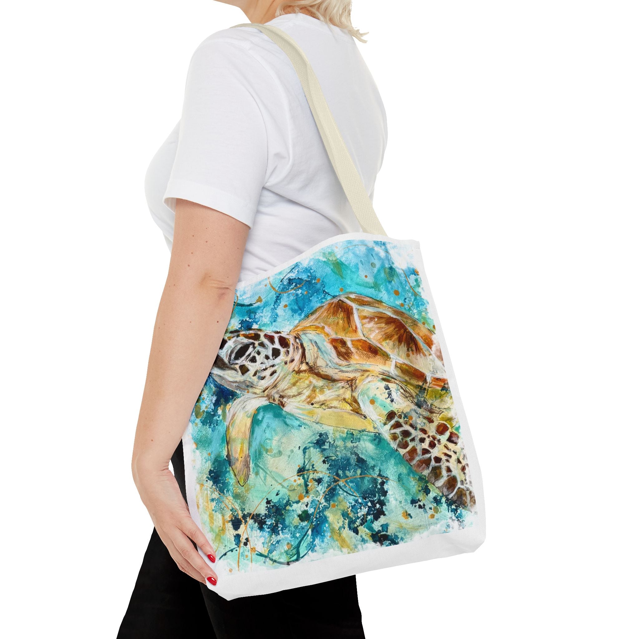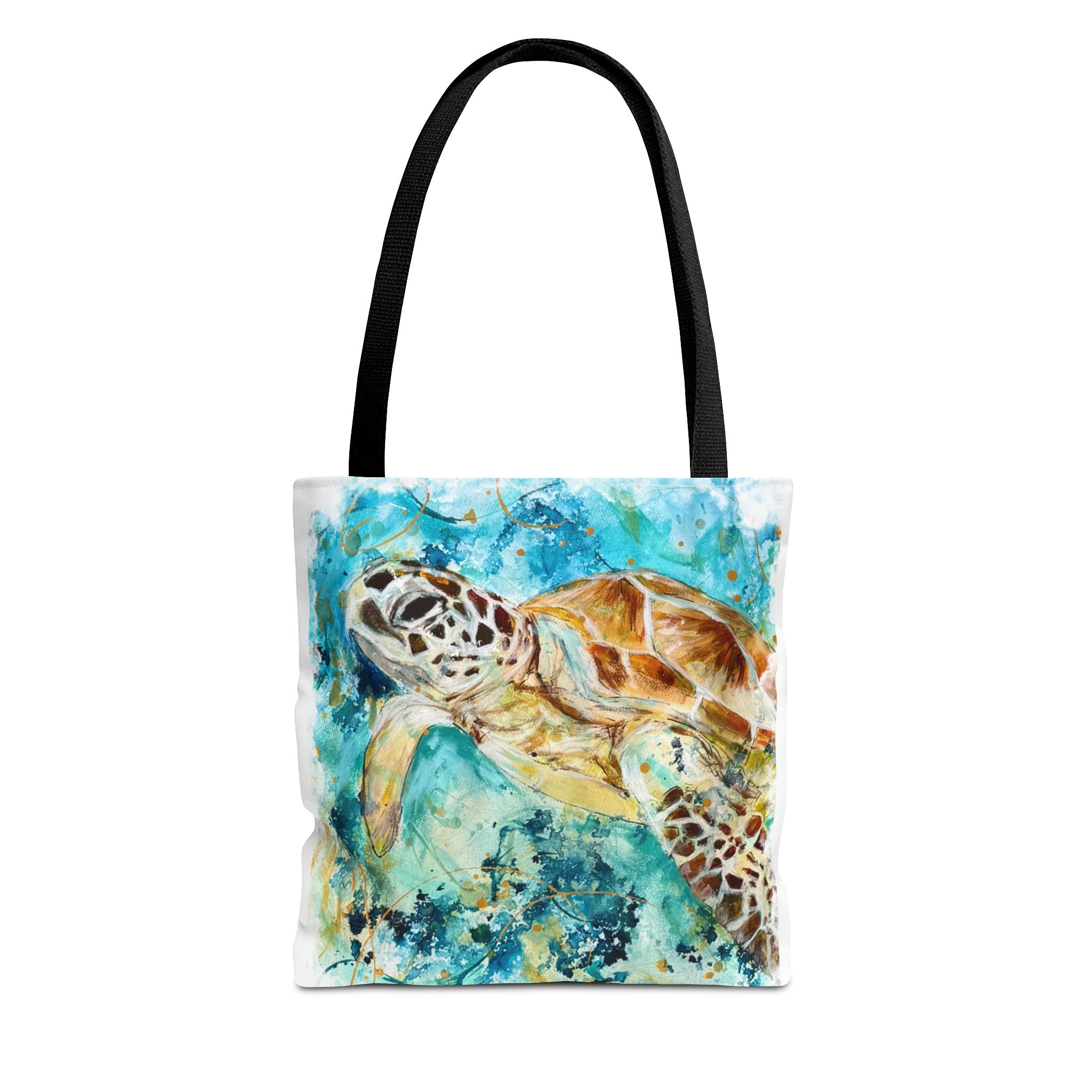 Carry a piece of the ocean with you. This durable polyester tote features a vibrant watercolor sea turtle gliding through turquoise currents — colors that still feel sun-warmed and salt-kissed. The roomy boxed corners give the bag real carrying space for market finds or beach gear, while the reinforced handle stitching and medium-weight fabric stand up to everyday use. Lightweight, quick-drying, and lined with a non-woven laminate, it balances artful style with practical resilience. Pick a handle color to match your mood and size to match your needs; this tote moves seamlessly from shoreline strolls to city cafés.