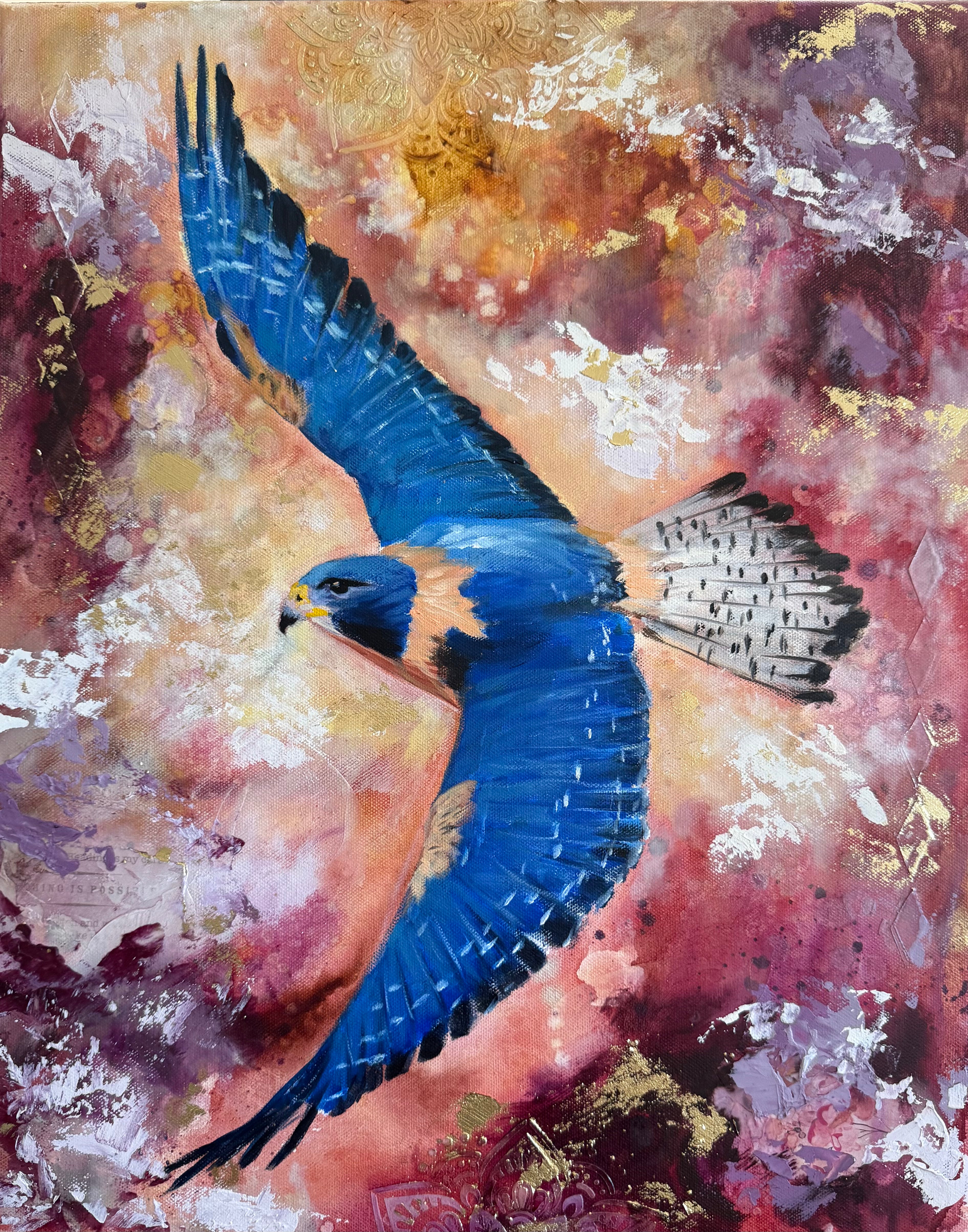 Original painting. Oil over mixed media on a 3/8" canvas. Edges are finished in gold, and hanging wire is attached on the back for quick, easy display. Comes with a certificate.