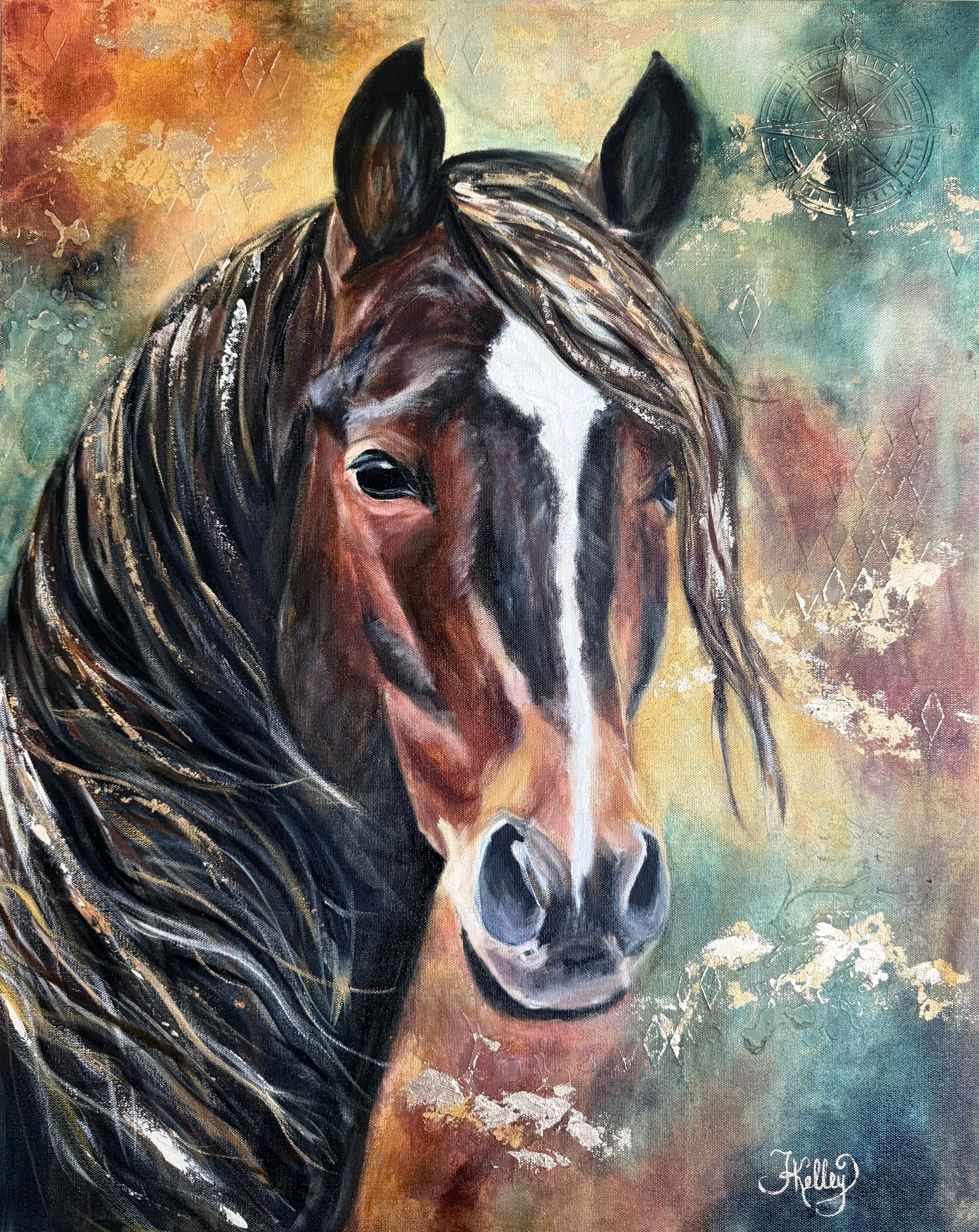 Original painting. Oil over mixed media on a gallery wrapped canvas. Edges are finished in gold, and hanging wire is attached on the back for quick, easy display. Comes with a certificate.